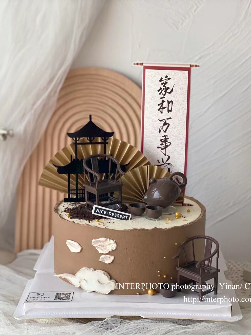 淘宝中式国风茶壶蛋糕装饰摆件家和万事兴茶师椅男士爸爸生日插件插牌