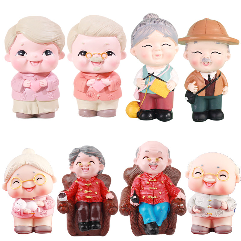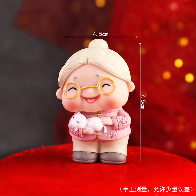 淘爷爷奶奶祝寿蛋糕装饰摆件抱猫老太拿茶壶老头网红生日甜品台插件