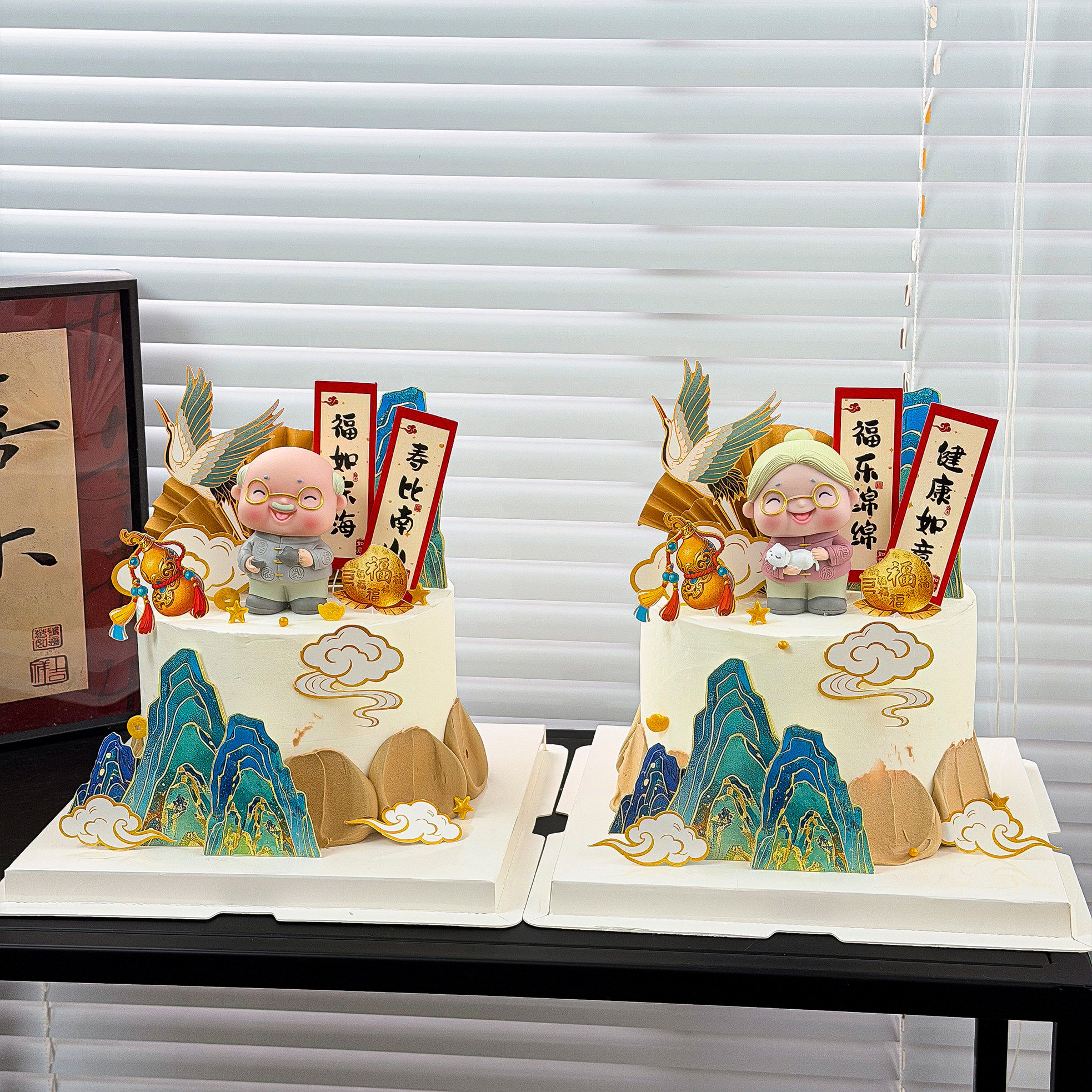 淘新中式祝寿蛋糕装饰摆件书法扇子屏风老爷爷奶奶生日过寿插件装扮