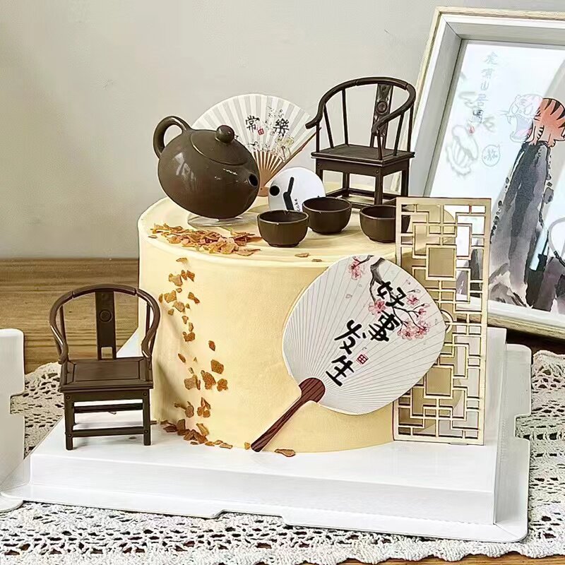 淘新中式长辈祝寿蛋糕装饰爷爷奶奶摆件国风扇子生日甜品台装扮插件