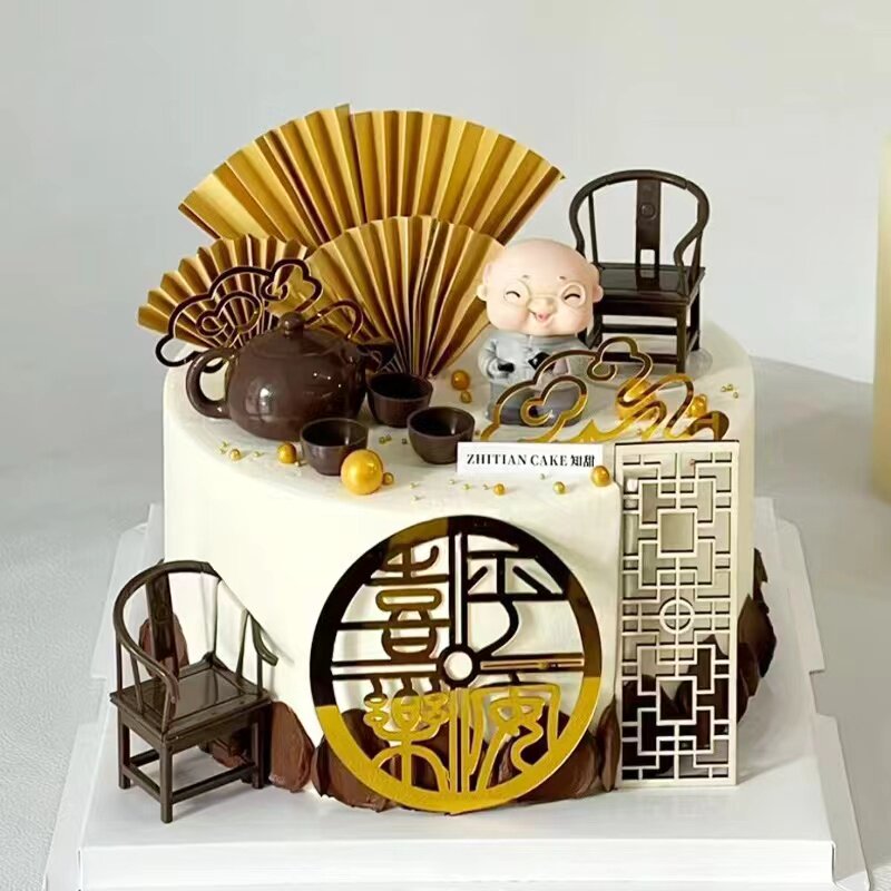这款新中式祝寿蛋糕装饰摆件,专为爷爷奶奶生日庆典精心打造,融合传统东方美学与现代甜品美学。以国风扇子、祥云、寿桃、仙鹤等吉祥元素为设计灵感,搭配典雅的红金配色,寓意福寿绵长、吉祥安康。摆件采用环保材质,精致立体,可灵活插于蛋糕或甜品台,提升整体氛围。配套插牌可定制祝福语,如“福如东海,寿比南山”,增添温情与仪式感。适用于寿宴、家庭聚会等场合,既传承文化,又彰显孝心,是献给长辈最贴心的视觉与心意双重礼赞,让生日甜品台成为爱与祝福的温馨舞台。