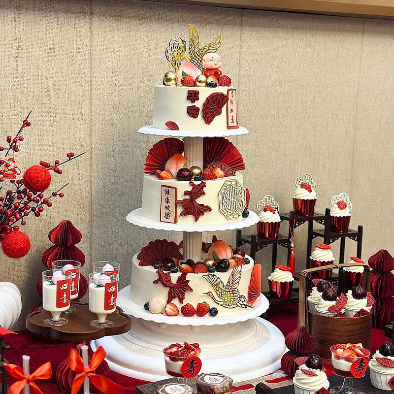 淘宝网红祝寿爷爷奶奶生日蛋糕装饰长辈寿宴红色系中式甜品台烘焙插件