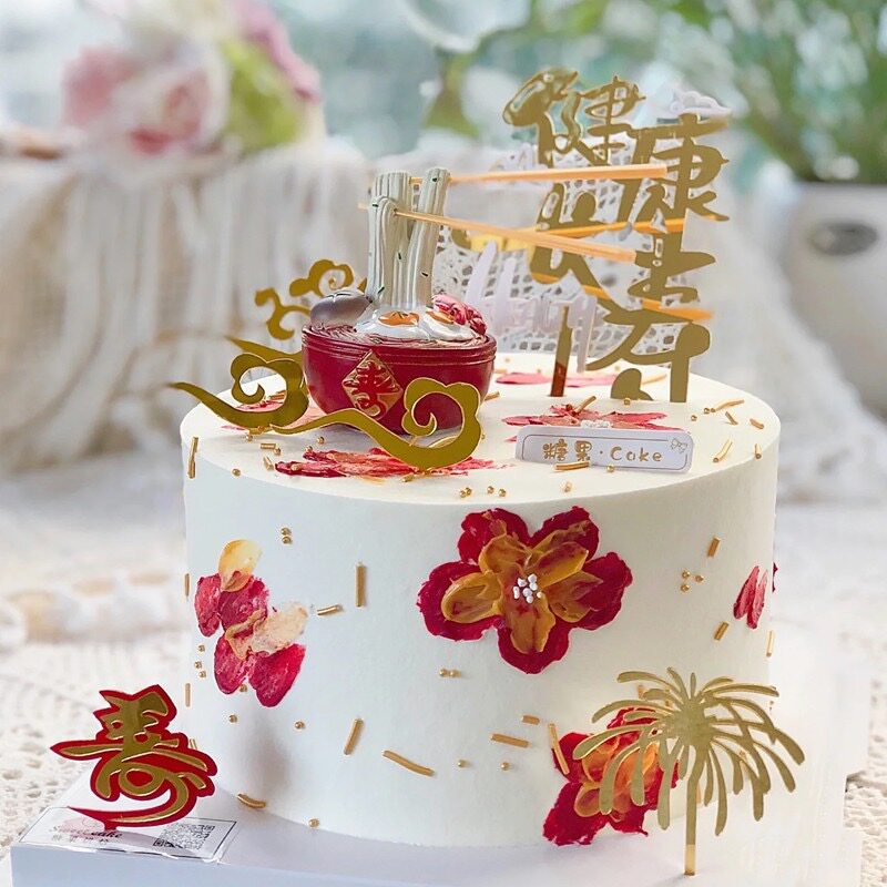 淘宝金色祥云团扇祝寿蛋糕装饰中式老爷爷健康长寿亚克力老人生日插牌