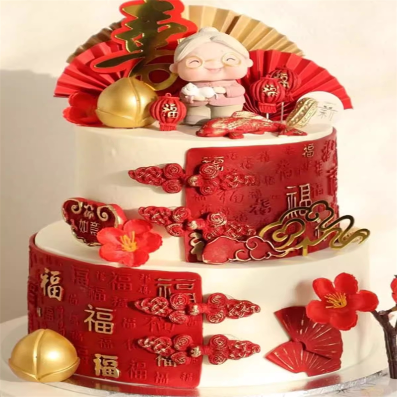 长辈祝寿生日蛋糕装饰爷爷奶奶父母生日摆件红金福字围边梅花插牌