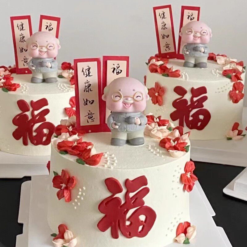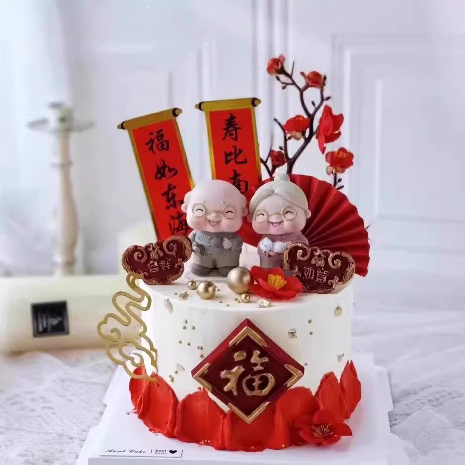 淘网红中式国风生日蛋糕装饰摆件老人祝寿爷爷奶奶寿公寿婆烘焙装扮