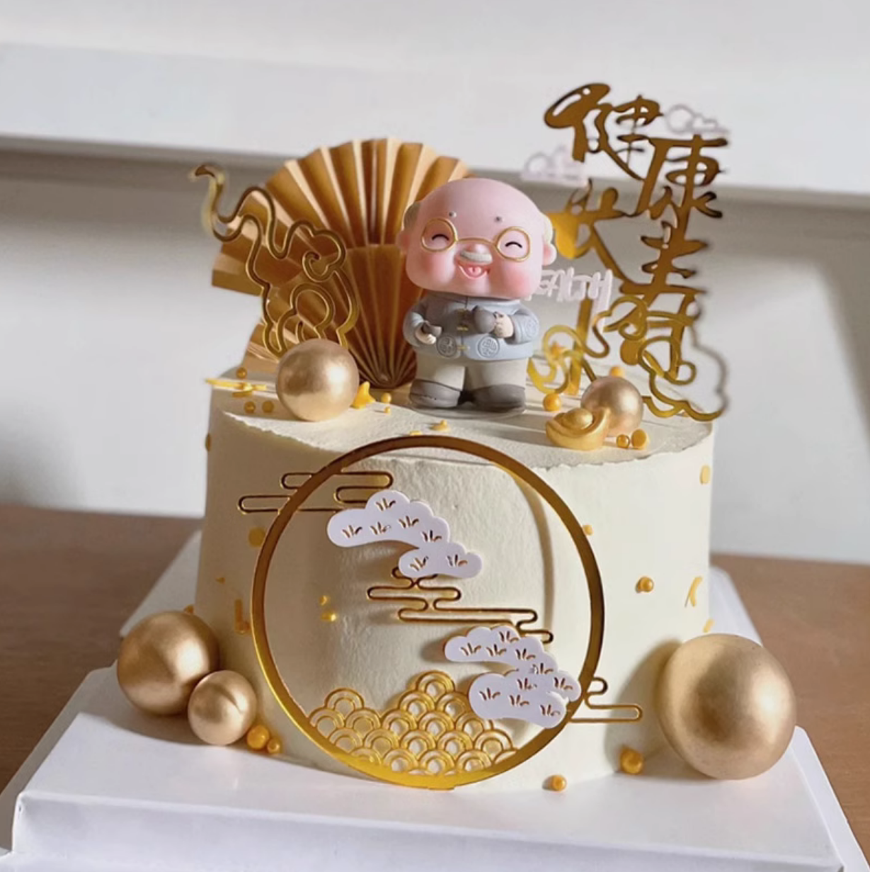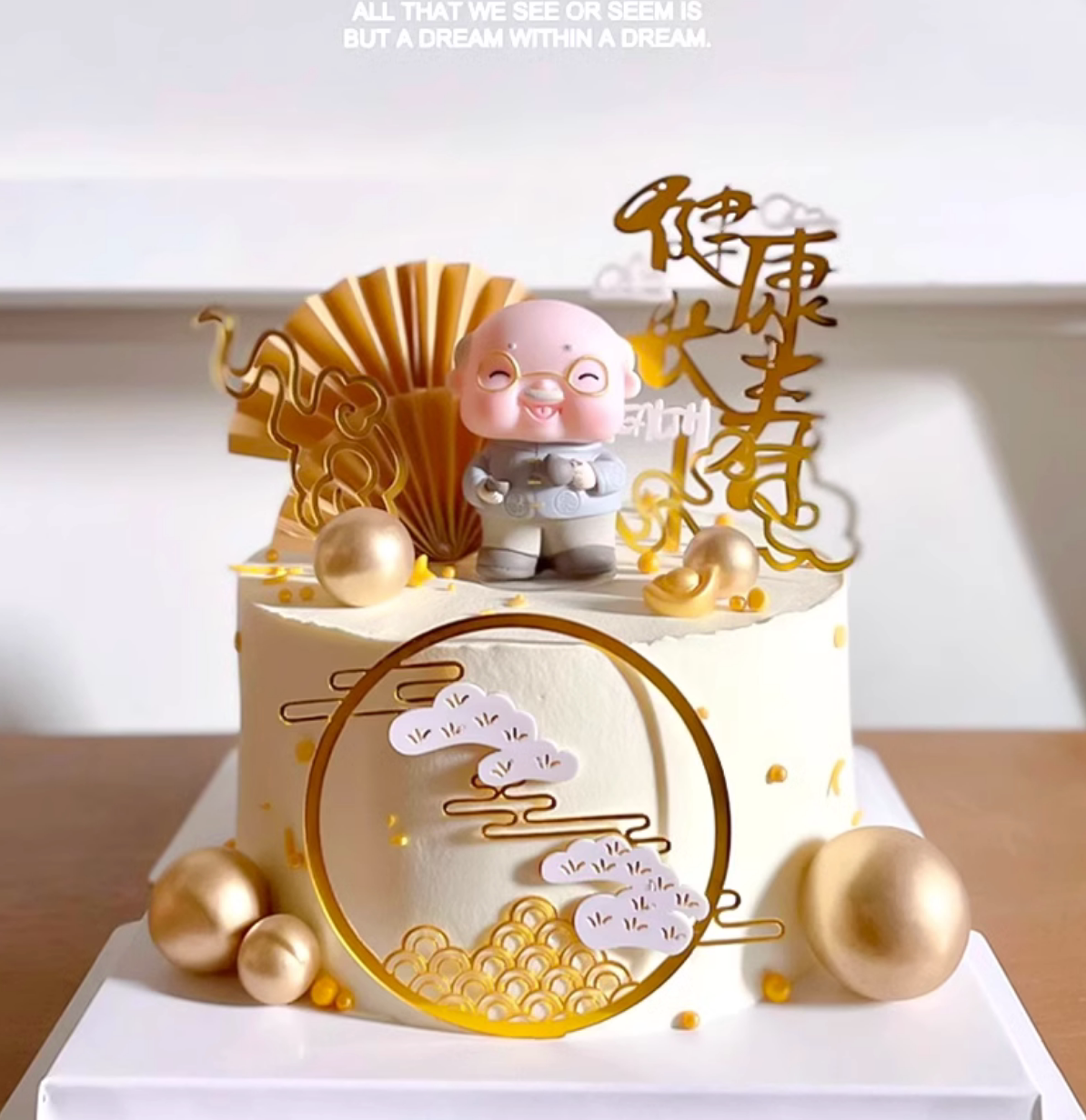 淘宝金色祥云团扇祝寿蛋糕装饰爷爷外公健康长寿爸爸亚克力生日插牌