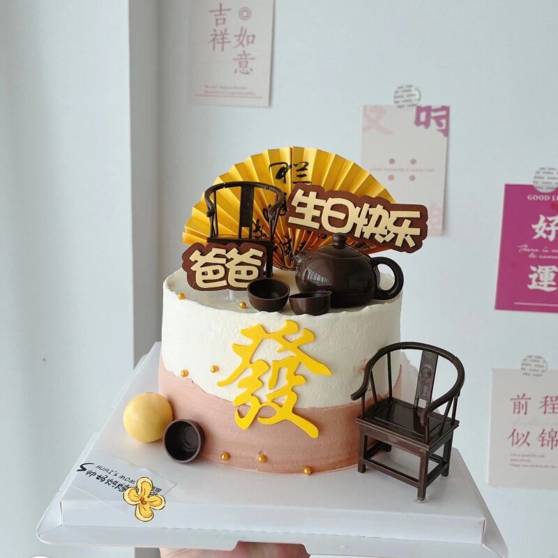 淘宝网红新中式蛋糕装饰太师椅茶壶茶杯摆件爸爸男神男士生日快乐插件