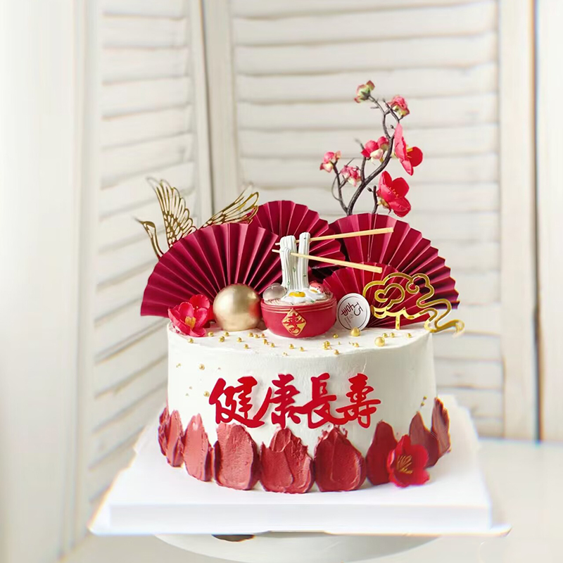 淘长辈祝寿生日蛋糕装饰爷爷奶奶父母生日摆件红金福字围边梅花插牌