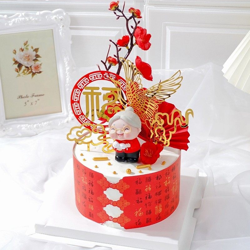 淘长辈祝寿生日蛋糕装饰爷爷奶奶父母生日摆件红金福字围边梅花插牌