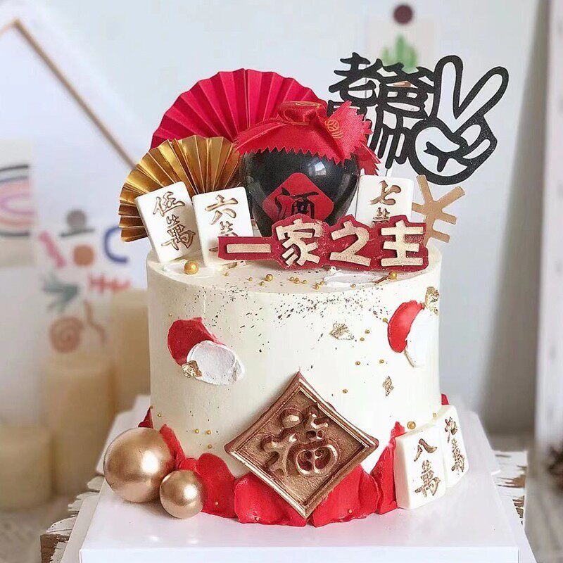 淘宝爸爸生日酒坛蛋糕装饰摆件网红麻将酒瓶白酒生日派对甜品台插件