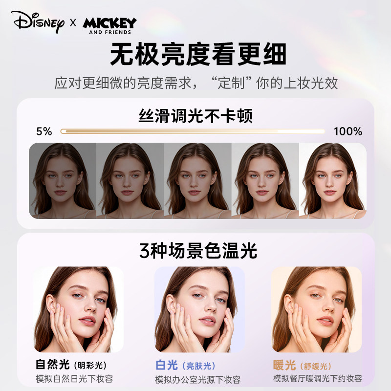 520情人节将至,为女友、闺蜜或老婆送上一份贴心又实用的迪士尼化妆镜,是表达爱意的绝佳选择。这款化妆镜设计精美,融入迪士尼经典元素,如米奇、艾莎或贝儿等角色,颜值超高,令人爱不释手。镜面高清,支持LED补光,三档调光适应不同环境,化妆、护肤更精准。小巧便携,可充电使用,居家出行皆宜。无论是生日、纪念日还是520表白,这份兼具浪漫与实用的礼物,既能满足她对美的追求,又体现你的用心与关怀,让她在每个清晨都感受到被宠爱的幸福。送迪士尼化妆镜,点亮她的每一天。